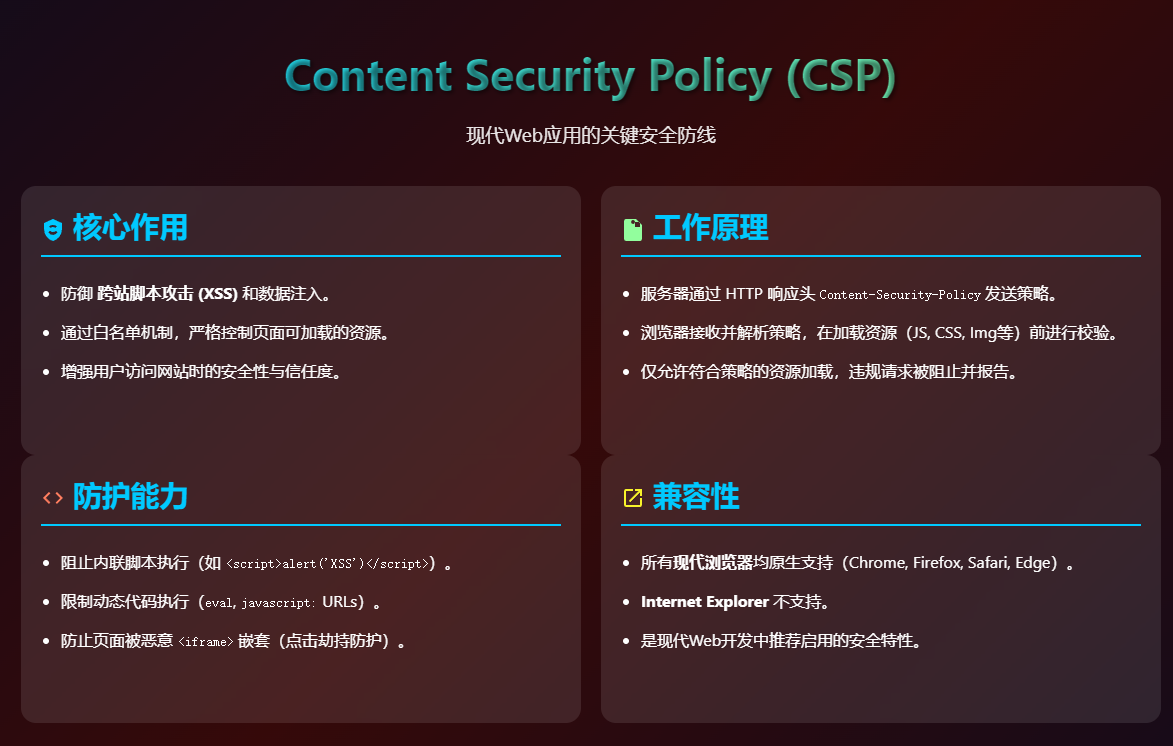 Content Security Policy(内容安全策略,简称 CSP)是现代浏览器提供的一项重要安全机制,主要作用是帮助网站防范多种常见的客户端攻击,尤其是跨站脚本攻击(XSS)和数据注入攻击。