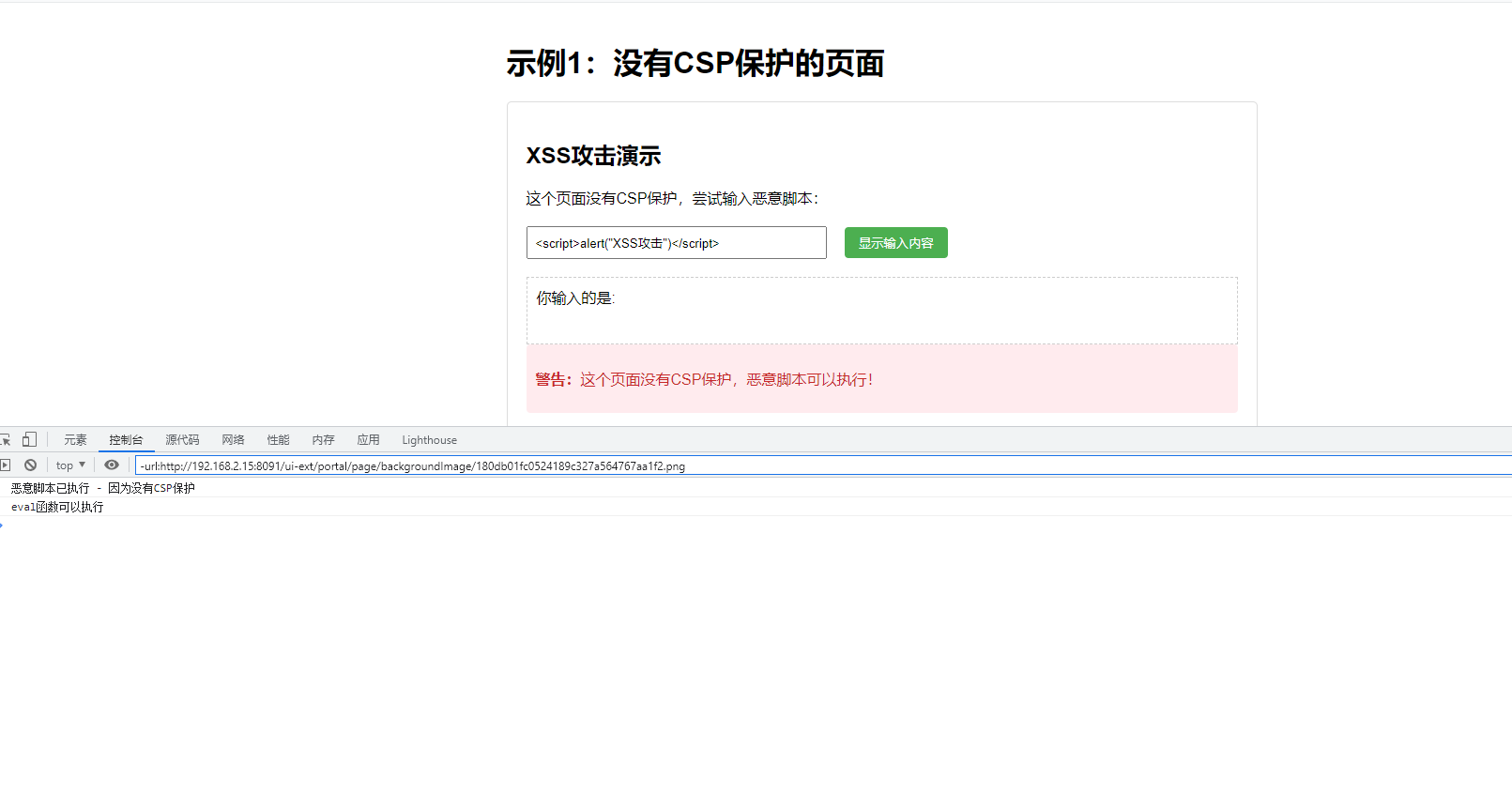 警告:这个页面没有CSP保护,恶意脚本可以执行!