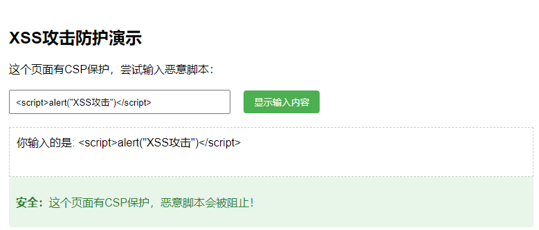 安全:这个页面有CSP保护,恶意脚本会被阻止!